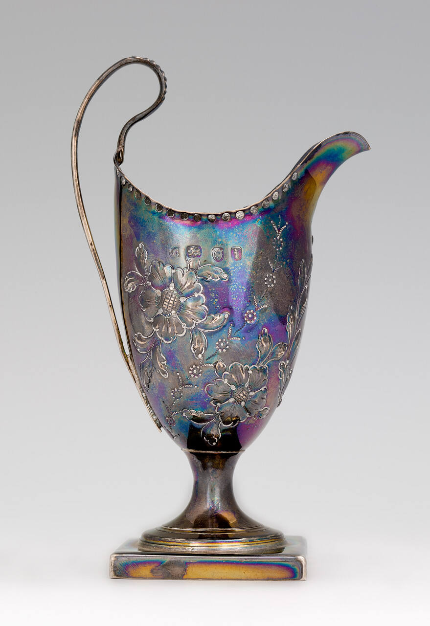 DescriptionRounded conical shape on stem and square base; curved handle, repousse floral pattern; punched beading border. Marks on body: B (rubbed), lion passant, leopard's head crowned, date i.