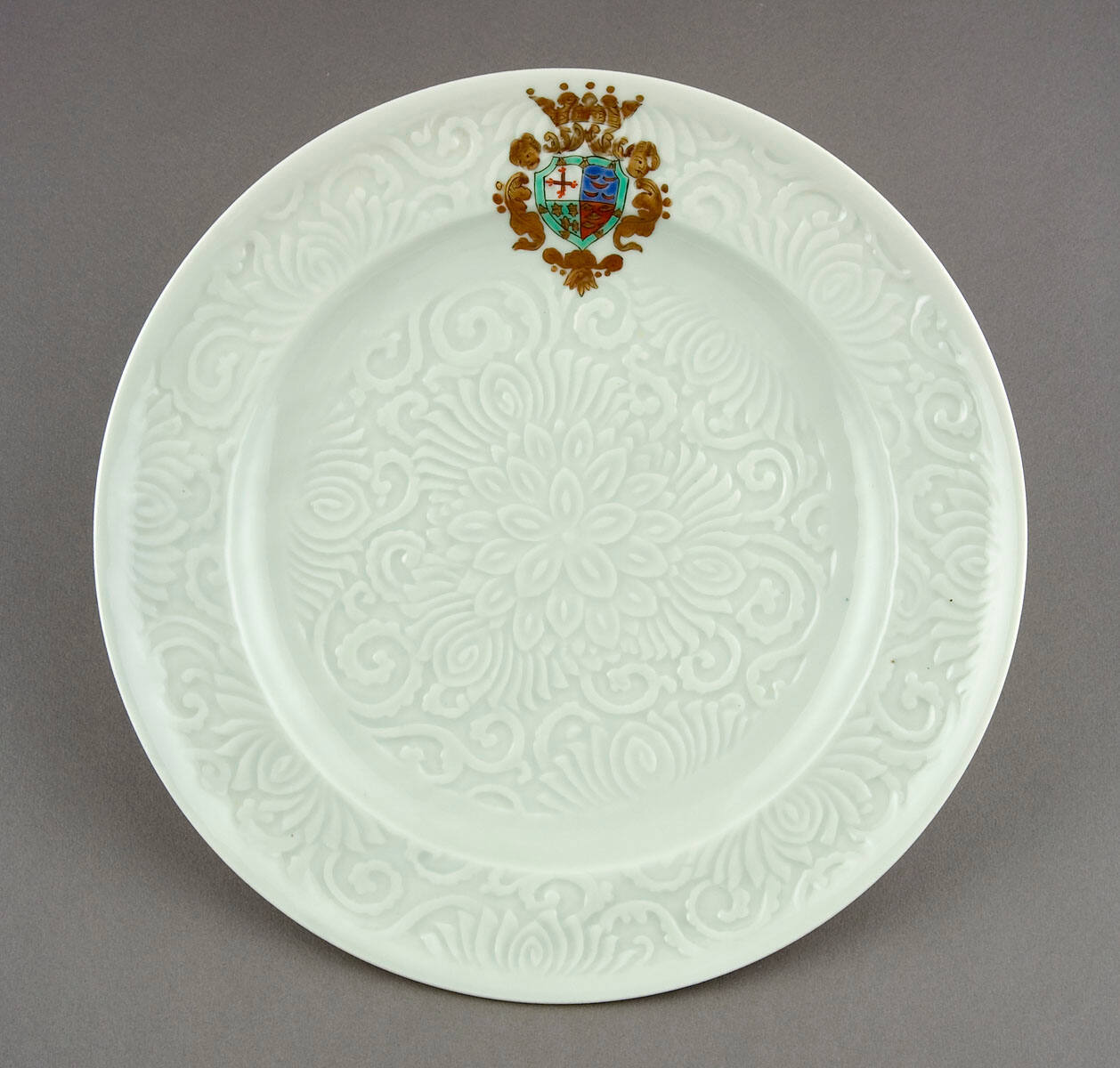 DescriptionPlate with depressed center and 1 1/4 " wide rim, raised white on white patterns of floral, S and C curves on rim and in center, smooth areas at outside edge of rim and outer part of depressed area, armorial design in gold leaf, red, blue and green placed at one side.