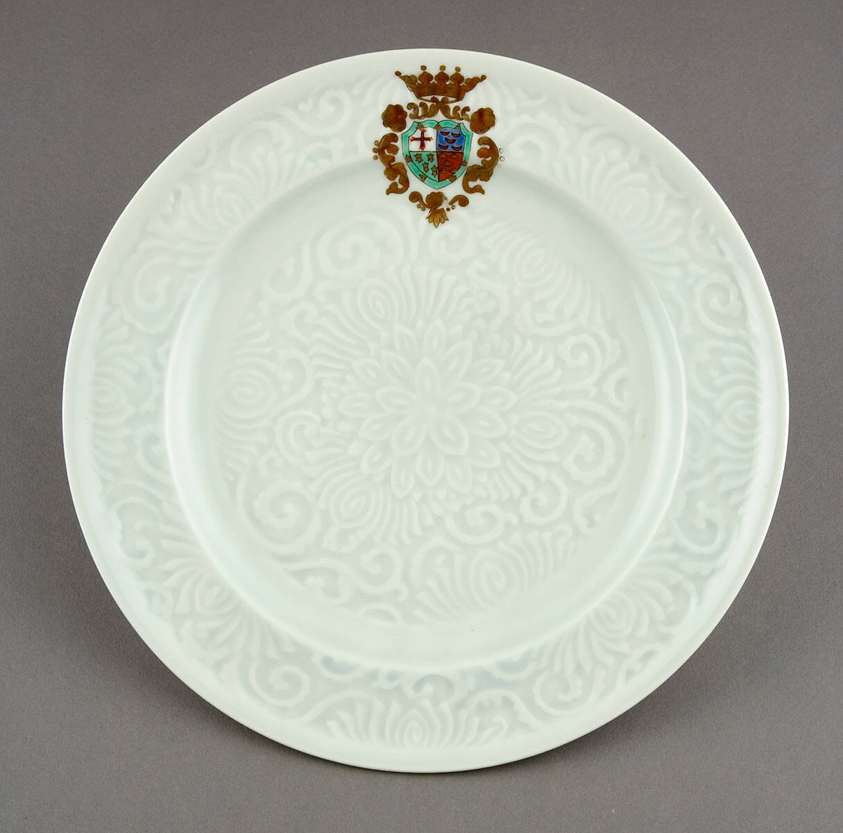 DescriptionPlate with depressed center and 1 1/4 " wide rim, raised white on white patterns of floral, S and C curves on rim and in center, smooth areas at outside edge of rim and outer part of depressed area, armorial design in gold leaf, red, blue and green placed at one side.