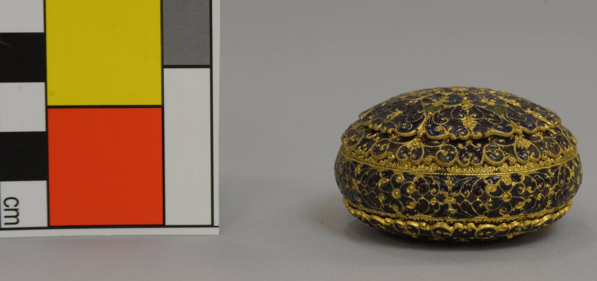 DescriptionCircular container with hinged lid and concealed catch; granular wire frame is gilt; interstitial translucent enamel is green, blue, red, lavender and yellow-green.Provenance
