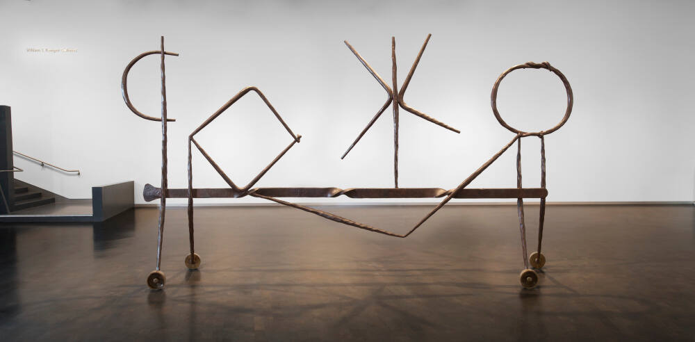 Gallery LabelIn welding steel, David Smith was a master calligrapher. Wagon III is a frieze of "drawn" iron signs supported by a horizontal bar half twisted in three places. At one end is a crescent moon, at the other a full circle, or sun-like shape. Between, are a six-pointed star and a diamond. The linear, celestial imagery is unique in character and theme in Smith's mature work.