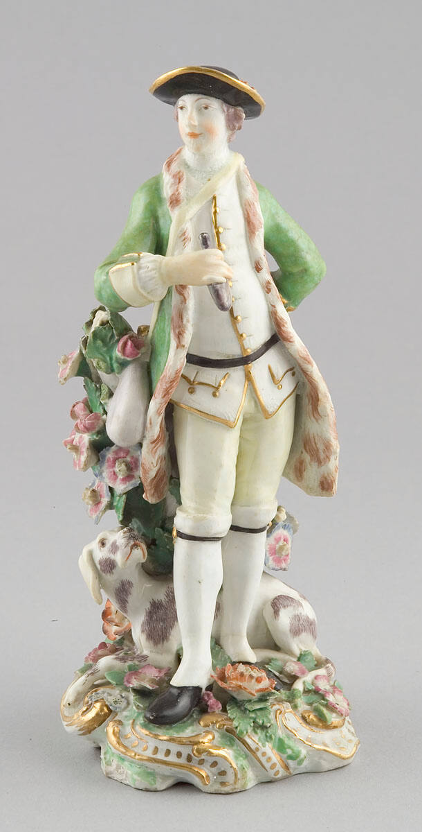 DescriptionA gallant dressed in a long green and white waistcoat and yellow breeches stands holding a flagon in his right hand, and holding his left hand behind his back. tree stump covered with flowers.ProvenanceWith Douglas R. Bird, Silversmith and Antique Dealer, Bath, England, by August 6, 1932;