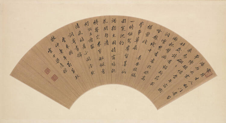 DescriptionFolded fan mounted as an album leaf. Currently surrounded by matte board in a horizontal frame. Calligraphy in ink on gold paper. There are twenty-one lines of calligraphy including the signature. In addition there are three seals, two to the far left of the calligraphy and one to the far right stamped over the first character of the poem.Exhibition HistoryChinese Calligraphy, Philadelphia Museum of Art, September 25 – November 7, 1971; Nelson Gallery – Atkins Museum, Kansas City, January 6 – February 6, 1972; The Metropolitan Museum of Art, New York, March 14 – May 7, 1972, no. 79.