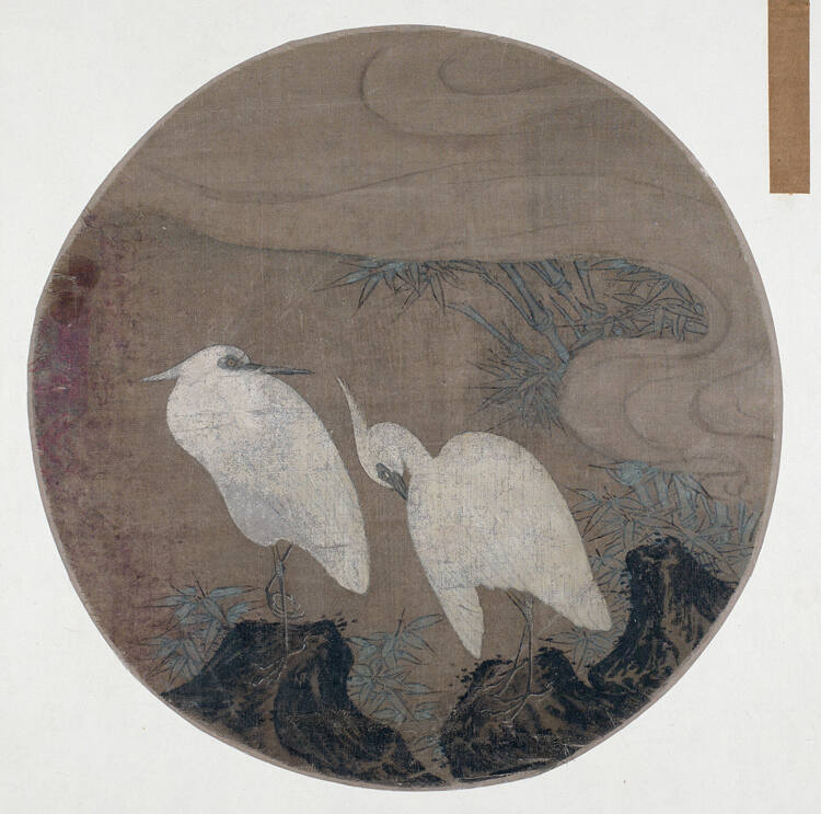 Gallery LabelTwo egrets perch calmly within a precarious environment, cleaning their feathers. Many Chinese people favor egrets for their sleek beauty and for eating bugs that damage farm crops. Because their long legs elevate their white feathers above the muddy marshes they inhabit, egrets symbolize the hope that officials remain above corruption.