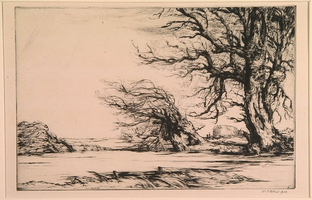 Gallery LabelThis melodramatic print recalls the spooky bare trees favored by British illustrators of the time like Arthur Rackham (1867–1939), or, for that matter, the fantastical dendroids of Roxy Paine (b. 1966), one of whose works can be seen outside the Bloch Building in the Sculpture Park. In this drypoint, the branches reach out like the tentacles of an octopus or a man-eating spider, driven by the high wind.