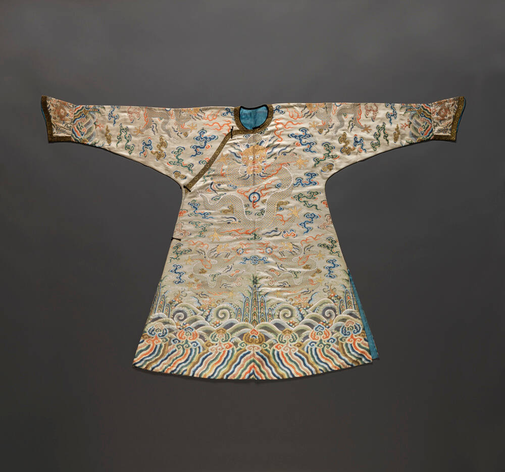 Found in a Qing dynasty (1644–1911) palace, this theater costume featuring nine dragons in designated areas resembles the dragon robes of the Qing court. The plain collar band and the creamy white ground, however, would have excluded it from court dress codes. An actor playing a high-ranking martial character would have donned this robe to entertain the emperor and empress. The fitted sleeves and horse-hoofed cuffs derive from the horse-riding lifestyle of the Manchu, founders of the Qing dynasty