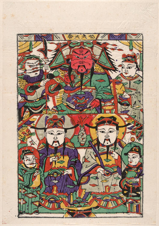 Gallery LabelThere are many gods of fortune, some of which were historical or mythical figures. For example, the print on the left shows the legendary warrior, Guandi. This red-faced hero came to be god of wealth because of his association with merchants. Below him are two gods, each of whom holds a gold bar or a ruyi scepter, symbols of wealth and recognition. The print on the right shows a fortune god and his wife with the same attributes. Despite their differences, all of these deities can grant the wish for increasing wealth, as signified in the treasure urn in the lower section of each print.