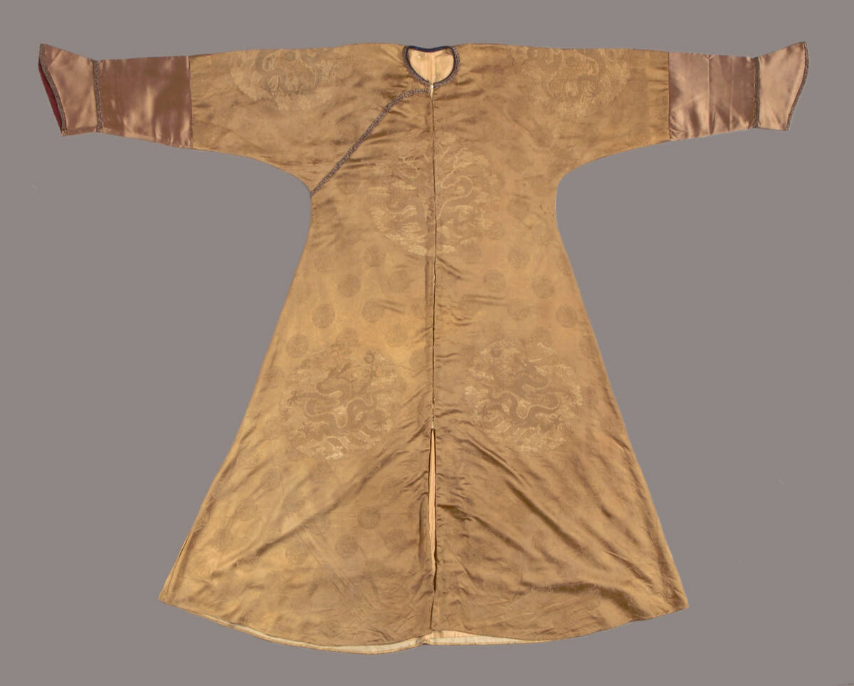DescriptionFront and sleeves of brocaded satin with large circular dragon pattern. Coat made up with new back.