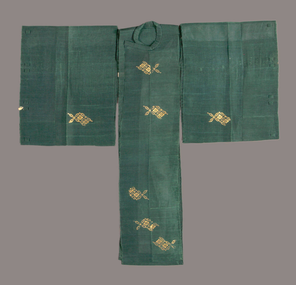 DescriptionUnlined figured silk twill gauze with metallic stencil designs. Unlined (hitoe) No robe (kariginu type).