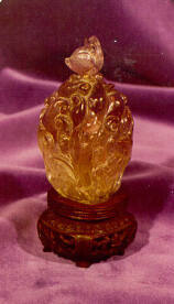 DescriptionEgg-shaped bottle carved in high relief all over with a flower design and bird, matching stopper with figure of a baby swan.