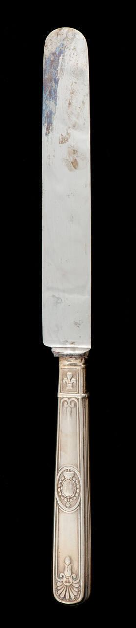 DescriptionStraight-handled knives, engraved with fleur-de-lis and other patterns. Coat-of-arms consisting of fleurs-de-lis, wreath, crown above and croix below.