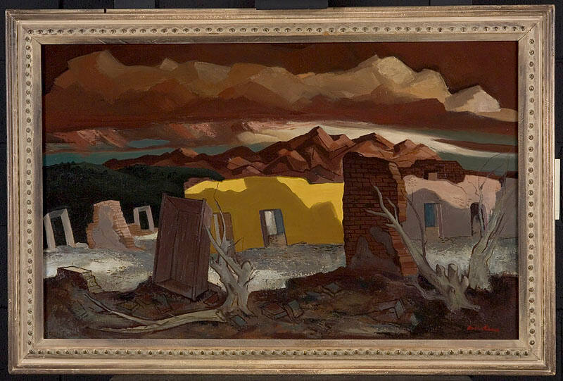 DescriptionDead trees, ruins of building against background of dark brown peaks.Copyright© Estate of Doel Reed