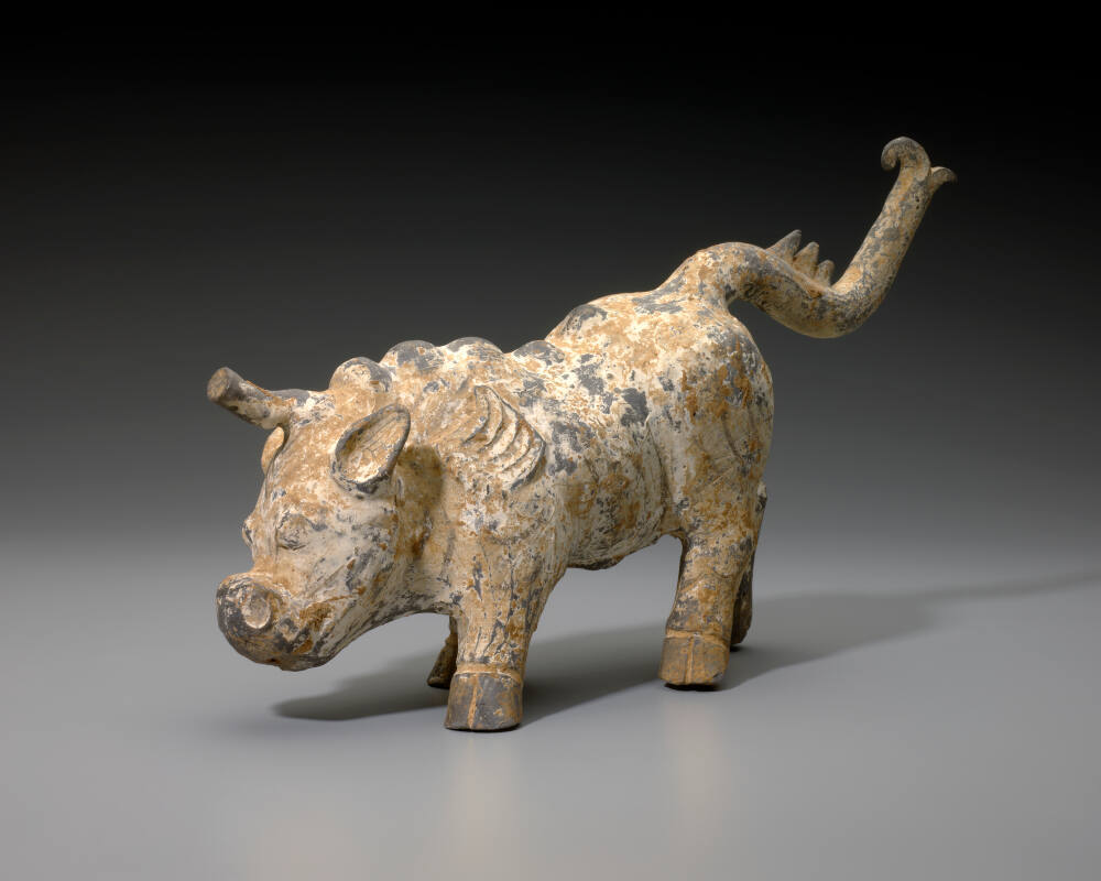 DescriptionEffigy of rhinoceros, long tail, traces of white polychrome.