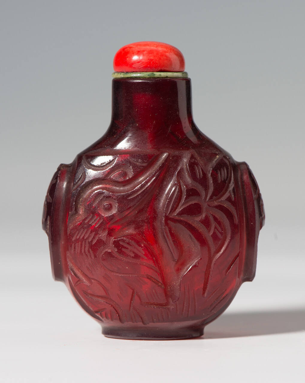 DescriptionRuby colored glass bottle with bird and flower design cut in sides. Pink stopper.ProvenanceElla Clark Loose (Mrs. Jacob L. Loose, 1860-1945), Kansas City, MO and Washington, DC, by 1934 [1];