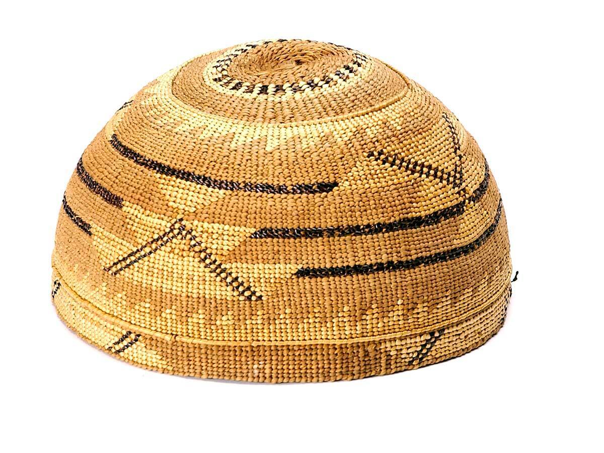 DescriptionBowl-shaped hat with buff and black designs on dark buff body.
