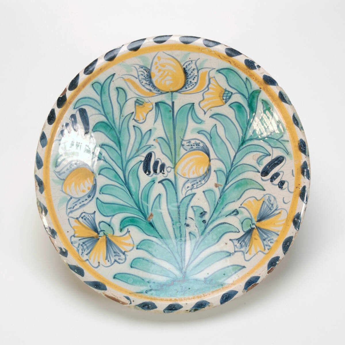 DescriptionOn a cream ground, painted with tulips in yellow,green, blue and black. Blue-dash border.