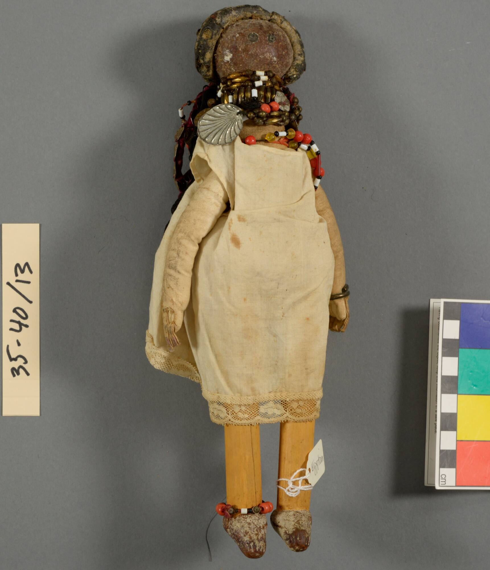 DescriptionWoman dressed in white garment, gold necklaces, elaborate headdress, long black thread hair. Bought from child in Khartoum, Sudan.ProvenancePearle Scales Moore (1867-1934), Peoria, IL, by 1934 [1];