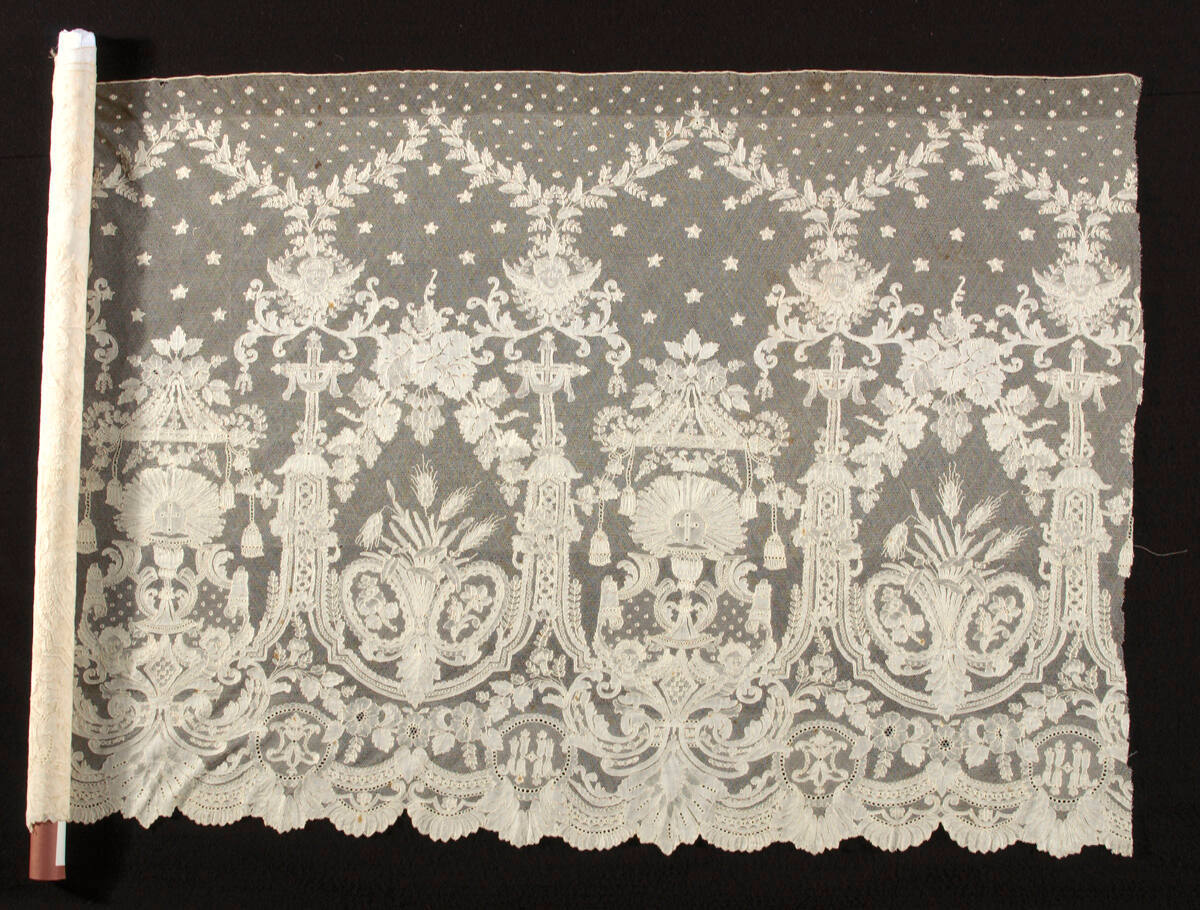 DescriptionBobbin-made straight lace. The flounce was made in seven (or more) horizontal strips and invisibly joined. It has a twist-net ground and a pattern worked in whale and half stitch with outlining threads, decorative meshes and openings. The right-hand end is starting edge. Bars of wheat alternate with the displayed host above a chalice with compartments separated by columns topped with a cross and surrounded by cherubs.