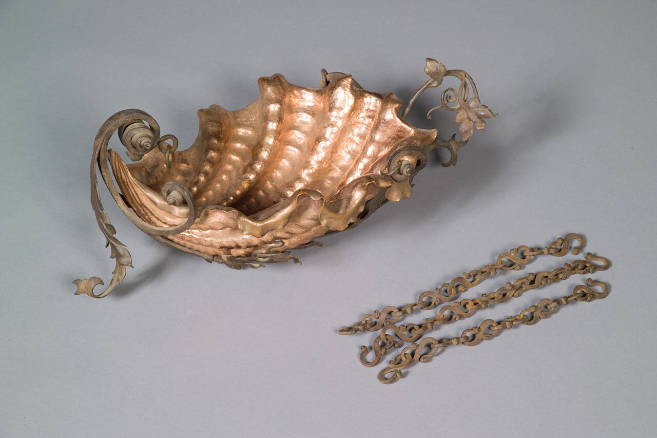 DescriptionFrom hand-forged, incised iron backet in scroll and convoluted leaf forms depends by three chains, frame holding copper basin shaped as a shell.