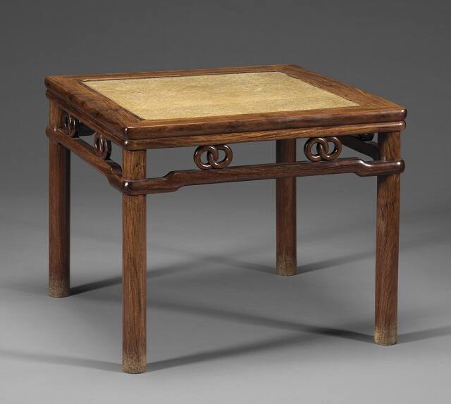DescriptionOne of a pair of huanghuali round leg stools of a design derived from bamboo manufacture with a seat frame constructed in two parts, the lower section being also convex but smaller in thickness and radius. The frame is drilled for soft seat construction but now with a hard matting seat with recent clay and lacquer to the underside. The round section legs are double-lock mortise and tenoned into the frame and splay slightly in both elevations. The are joined by high humpback stretchers, convex to the outer surface and flat to the inside, mitred at the corners and tenoned into and lapped around the legs with two interlocking double "cash" motifs to each side. 17th century.Gallery LabelThe circular legs and the way the stretcher wraps around the leg imitate features of humble bamboo or reed stools. The original seat was woven cane, but was replaced with a solid seat. We have added a square of silk brocade said to have come from the tomb of an imperial prince.