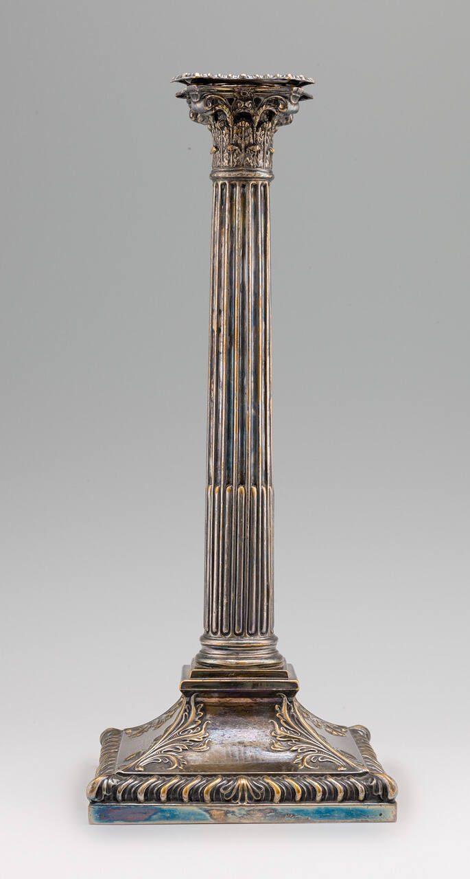 DescriptionSheffield candlestick with square base, fluted column topped with a Corinthian capital