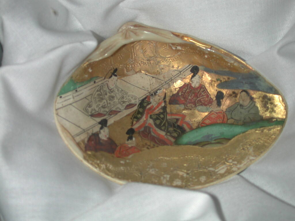 DescriptionOne of fifty clam shells. The shells are slightly smaller than a human palm, decorated with paintings on gold paper pasted to the iridescent inside surface. The top and bottom portions of the paper of each shell is embossed with hexagonal patterns. The images in the middle are mostly interior scenes with figures in bright Japanese costume. Men appear in rigid court robes. Women's long black hair streams down their backs. The paintings are peeling off at the edge. The shells were formerly stored in two gridded wooden boxes, 25 in each.