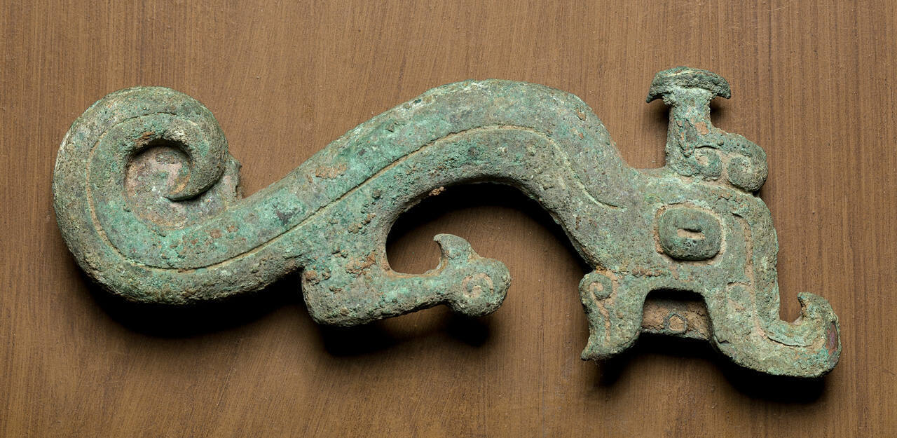 DescriptionDragon in abstract design, facing left, light green patina.Provenance