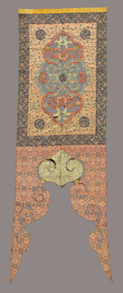 DescriptionTemple valance for hanging between pillars. Upper part is a rectangle of cream color brocaded silk with a large elongated quatrefoil of cut-work in the center and coin designs in each of the four corners. The top rectangle is bordered with gray-green brocade. The lower part is red brocade, arched at the bottom, ending in ju-i forms, with a center form in green.