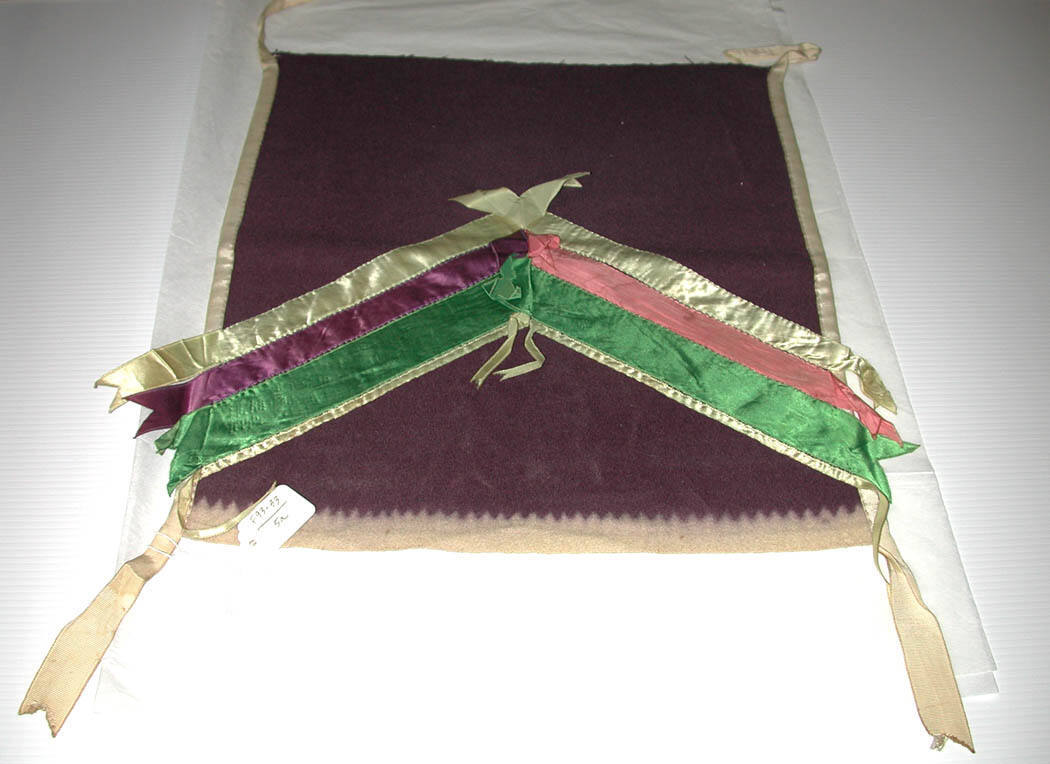 DescriptionEach panel consists of a dark purple wool tradecloth (possibly cut from a trade blanket) applique in geometric patterns. Each panel is edged along the sides with ties and tails of cream-colored grosgrain ribbon.