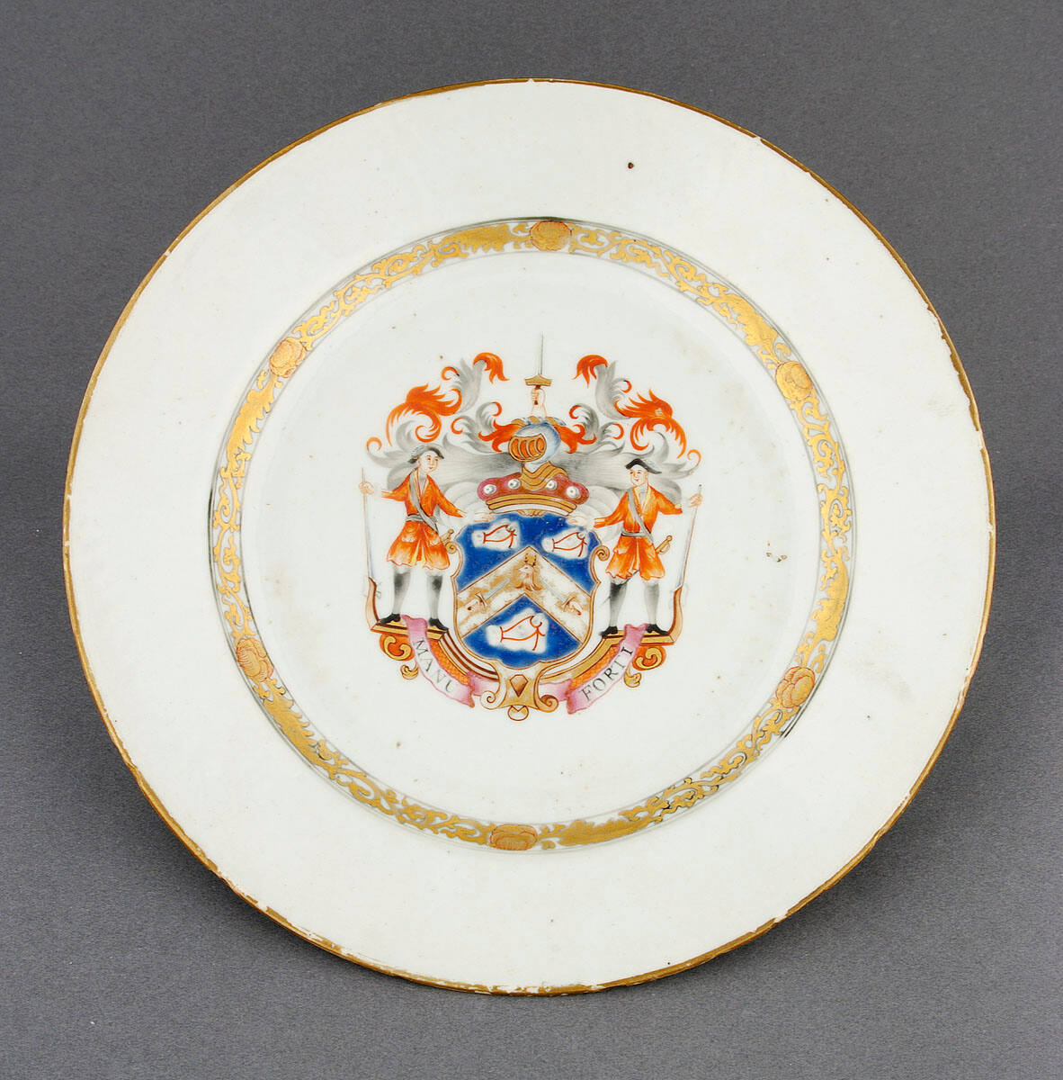 DescriptionPlate with Coat-of-Arms of Baron Reay Mackay in blue, red and gold, consisting of two red-coated figures with rifles on either side of escutcheon with bears the inscription MANU FORTI; gilt scroll and foliate border on cavetto; shoulder is plain except for narrow gold rim.