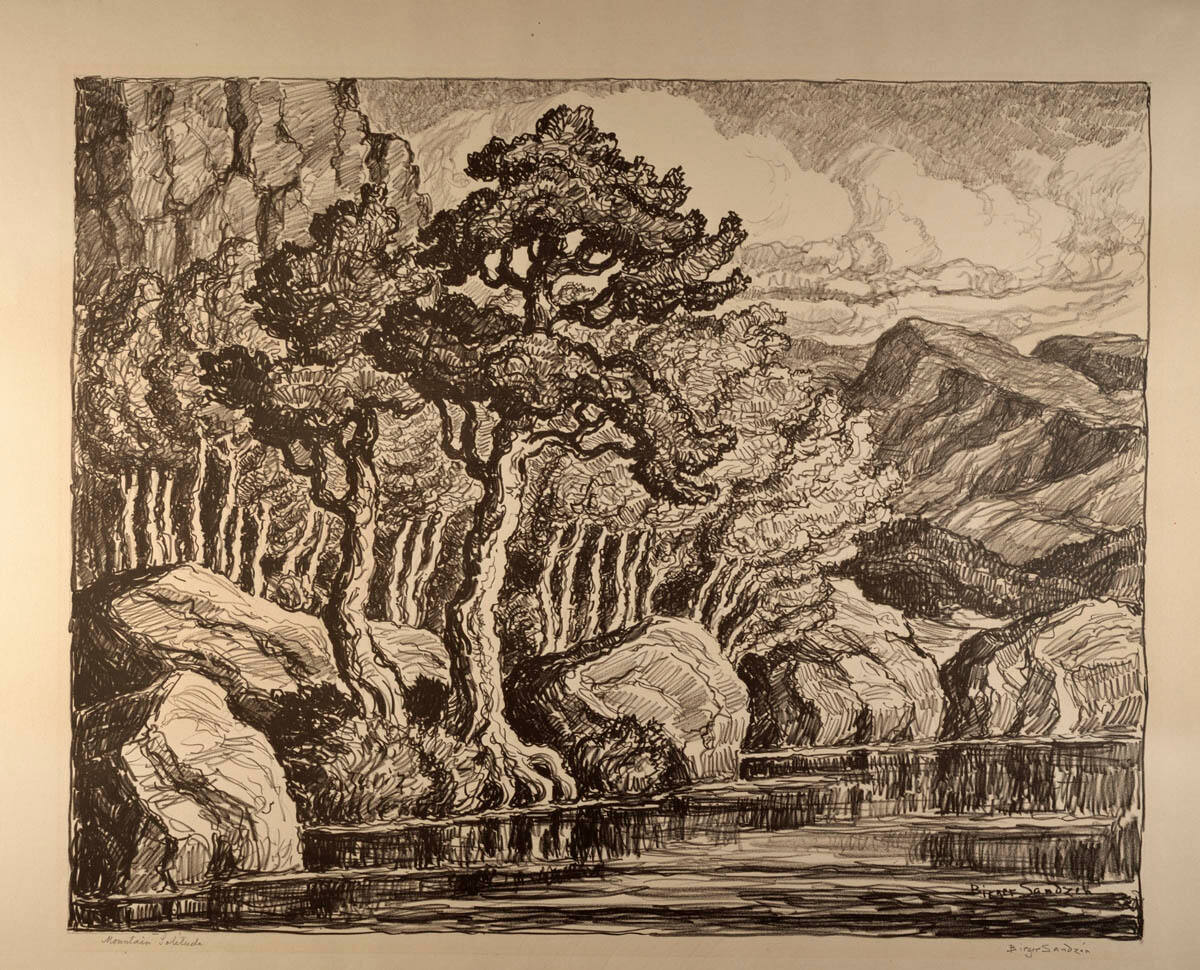 DescriptionBeyond foreground expanse of water with reflections, two large umbrella pine trees rising from rocks on far shore, line of smaller trees, behind. Right, range of rising peaks. Top left corner, towering rocky face.Gallery LabelDuring breaks in his teaching schedule at Bethany College in Lindsborg, Kansas, Sven Birger Sandzén escaped to the mountains of Colorado and Utah. He often made lithographs such as Mountain Solitude from drawings that he executed while on such excursions.