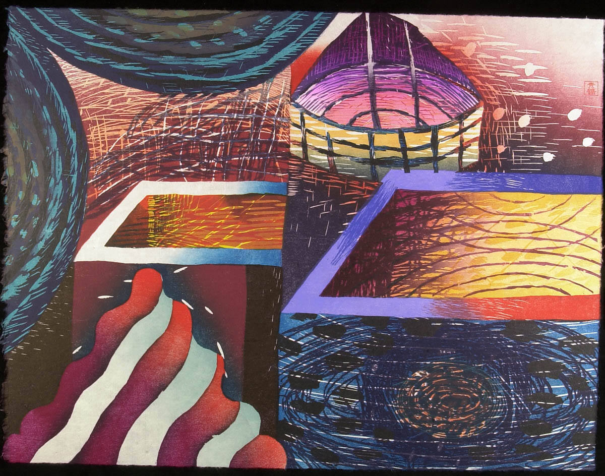 DescriptionCombination of brightly colored images includes what looks like an American flag at the lower left and two box interiors at the center. Swirling patterns are evident throughout.Copyright© Karen Kunc