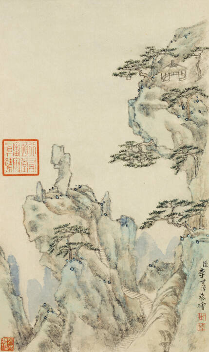 Gallery LabelLi Shizhuo was a Manchu official who learned brushwork from celebrated literati artists of his day. His paintings continue the classic landscape traditions, but at the same time, they demonstrate an individual sensibility in the dry brushstrokes that sculpt the boulders and cliffs and the fine lines that describe the curvilinear patterns of clouds and water. In general, his use of color also follows literati tradition, which employed it sparingly, more to add emotional intensity to a scene than to enhance its descriptive purpose. The bold use of flame red in the painting of sunrise, however, is unprecedented and seems to reflect a new interest in representing more realistically the shifting moods of nature.