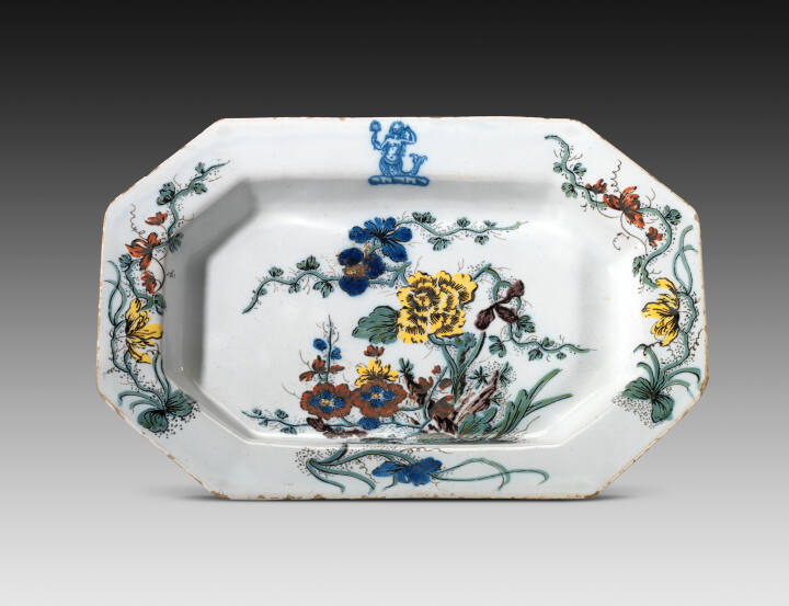 DescriptionWhite ground decorated in polychrome with large floral group, center, and smaller sprays on three sides of the rim, crest of the Scottish family Rutherford (a mermaid) on top rim.Gallery LabelDelftfield Pottery, opened in 1748, was the only Scottish pottery to make tin-glazed earthenware, with much of its output exported to America. The mermaid crest on this small platter or under-plate indicates it was made for the Scottish family Murray of Polmaise.
