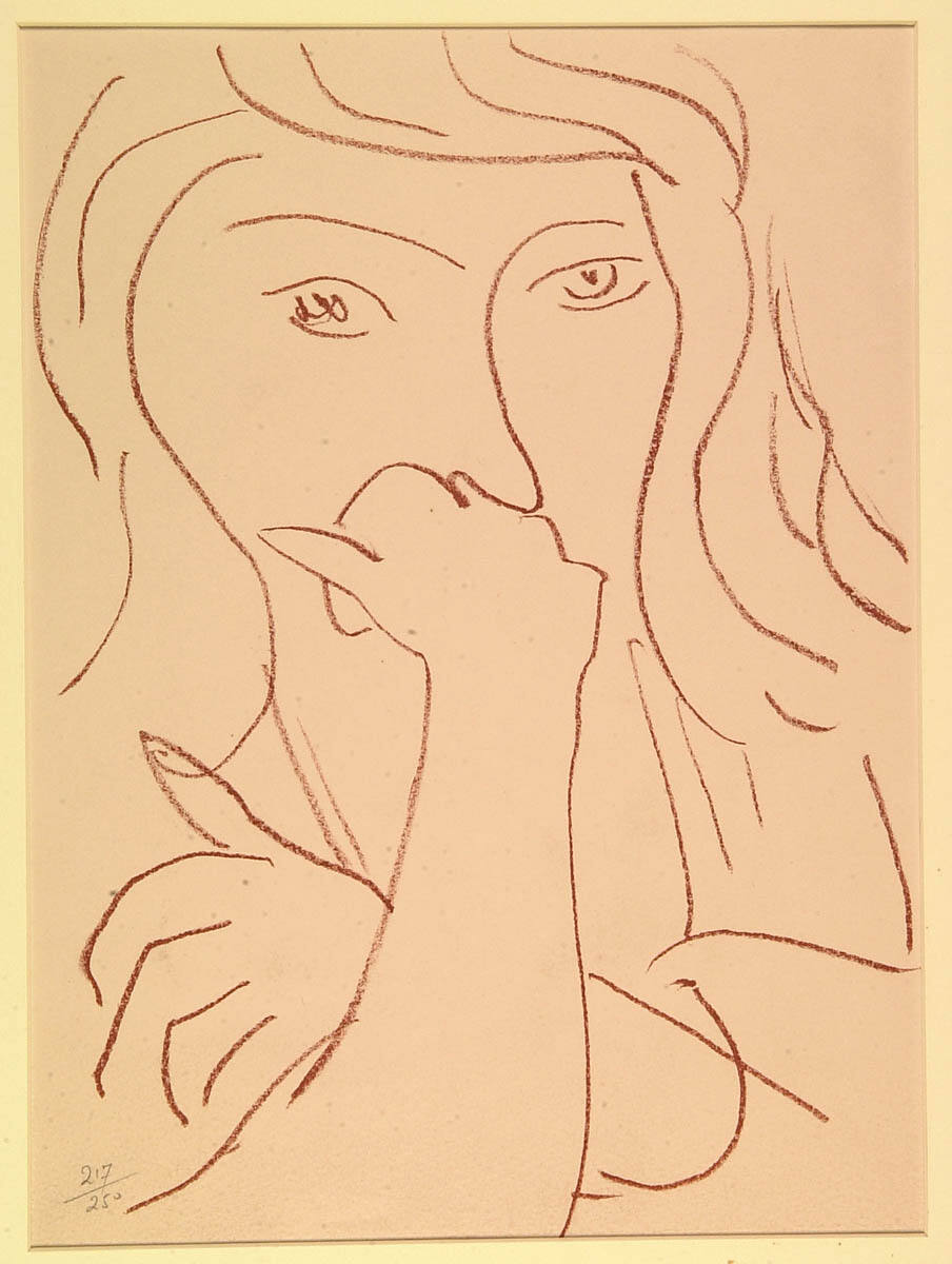 Gallery LabelHenri Matisse was a master of line. A mere 41 strokes comprise this pensive image of a woman. The fluidity and firmness of line convey her youthfulness, but her eyes and the position of her arms and hands tell a different story. With her arms crossed and her face resting upon her right hand, she assumes a weary, thoughtful posture. Her distant gaze underscores this sense of psychological remove.
