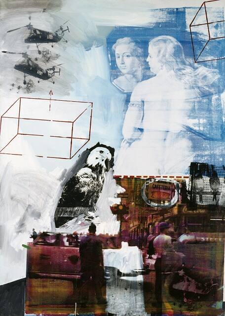 Tracer is one of the 79 silkscreened paintings Robert Rauschenberg produced between 1963 and 1964, whose imagery is derived from everyday information- photographs, newspapers and magazines. Tracer alludes to the Vietnam War by incorporating American symbols of war and patriotism-army helicopters and a bald eagle. It also juxtaposes an urban street scene and a reproduction of Peter Paul Rubens' Venus at Her Toilet (ca. 1613-15), a classic image of beauty and love.