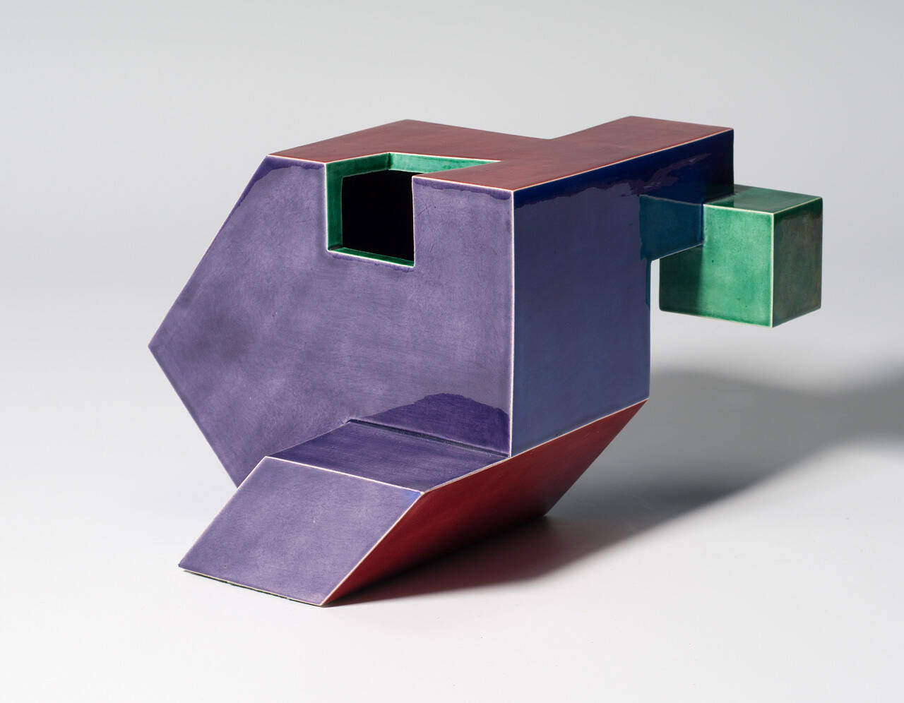 DescriptionEight-sided bollow block form. perforation along upper right edge. Polyhedron attached at bottom of right side. side, onto which is attached a green square. plane a solid color--usually purple or blue but also some red and green. between planes are thin white lines.Gallery LabelKen Price urges, "Don't just look at these things, get in close…explore intimately…." The reward for giving this ceramic work a closer look is a multi-faceted exploration of brilliantly glazed planes that vibrate in harmony and contrast. Price's works are often described as three-dimensional drawings of color, and he is credited with being at the center of the American Abstract Expressionist ceramics movement. Here, strong geometric form and volume are achieved as much by the bold juxtaposition of colors as they are by the crisply delineated surfaces composing the structure.