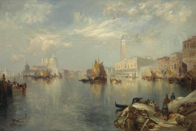 Moran followed a long line of artists who painted Venice, including English painter J. M. W. Turner, whose feathery brushwork and poetic treatment of light exerted great influence on the American.