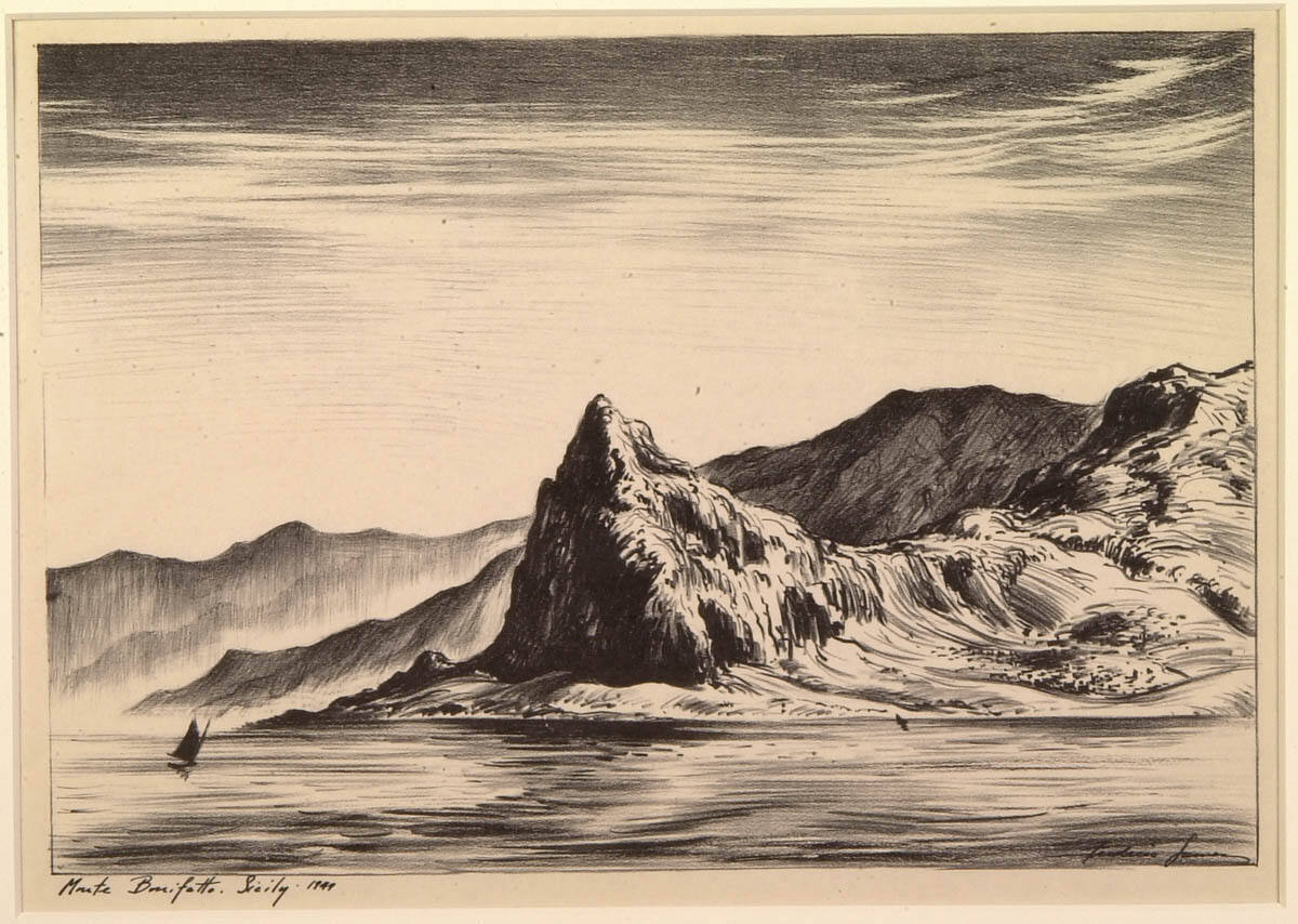 DescriptionOn far side of water, center, pointed promontory extending right into lower saddle, rising to blunt peak, right middle, diminishing slope, left. Beyond, range of mountains lessening in height, right to left. center, darkening toward top, with streaming white clouds interspersed. Small sail boat, lower left center.Copyright© Estate of Frederic James
