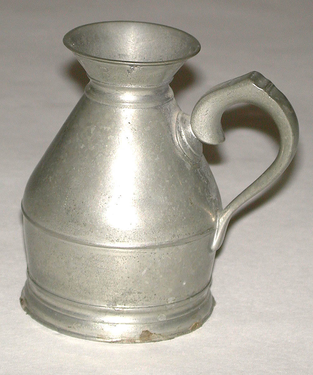 DescriptionRing-like base with several ridges. Lower body in slightly flaring bowl form; upper body an inverted truncated cone. Incised line where base and lower body join. Ridge or reeding between upper and lower portions of body. Wide flaring rim bearing various inspectors marks. Curved handle attached below rim at boss. Touch mark on bottom; "Austen & Son Cork" over rampant lion above crown; below crown, "Imperial". In recess "94 North Main Street." "1Pint" engraved on upper body.