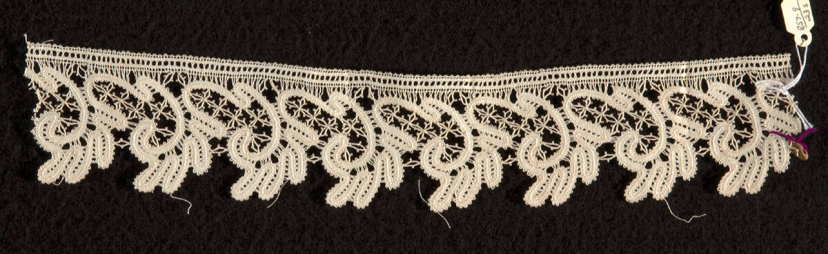 DescriptionBobbin-made straight lace made with the aid of a hook. Whole stitch tapes worked with a central cordonet. Linking picot-decorated bars.