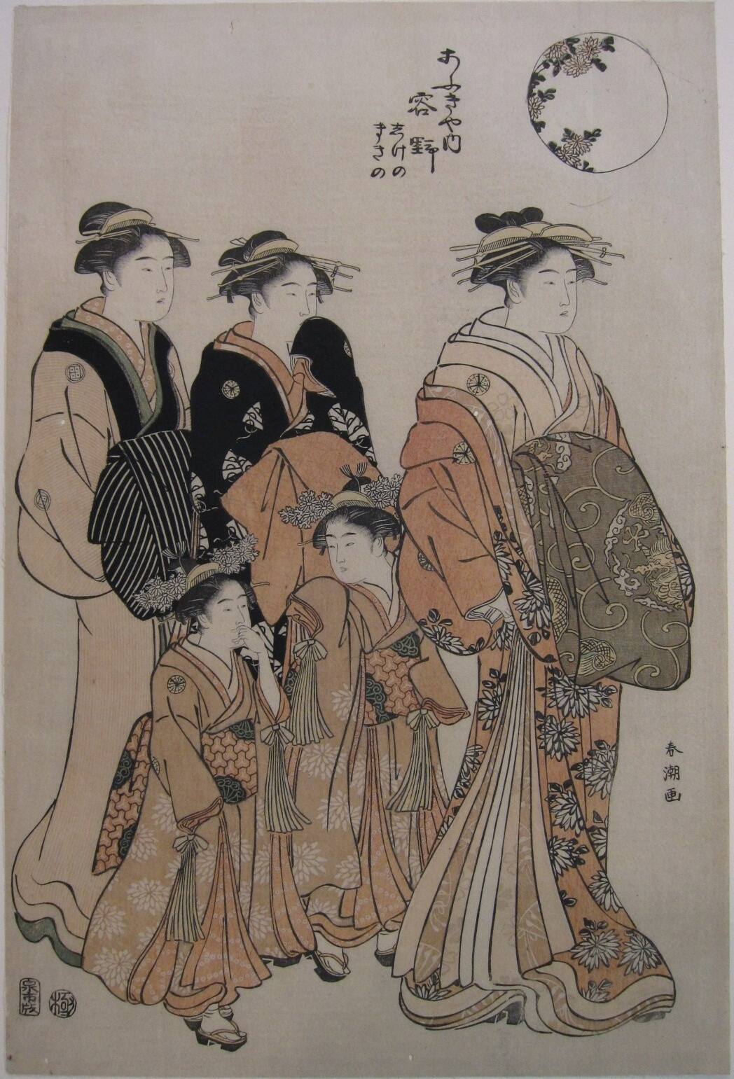The Oiran Yono of the Ogi-ya Walking with her Kamuro and Two Shinzo