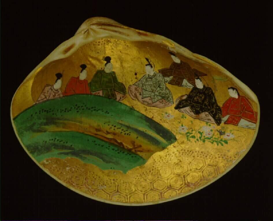 DescriptionOne of fifty clam shells. The shells are slightly smaller than a human palm, decorated with paintings on gold paper pasted to the iridescent inside surface. The top and bottom portions of the paper of each shell is embossed with hexagonal patterns. The images in the middle are mostly interior scenes with figures in bright Japanese costume. Men appear in rigid court robes. Women's long black hair streams down their backs. The paintings are peeling off at the edge. The shells were formerly stored in two gridded wooden boxes, 25 in each.Gallery LabelA set of painted shells like these made a suitable wedding gift because the two halves of a clamshell match only with each other. Each pair is painted with identical images of well-known tales. In a traditional game created by aristocrats during the Heian period (794–1185 c.E.), the pairs were separated into two groups. The shells from one group were placed on the floor with the painted side down, and the goal was to pair each shell with its mate in the other group. Paired shells like this remain a symbol of good marriage today.