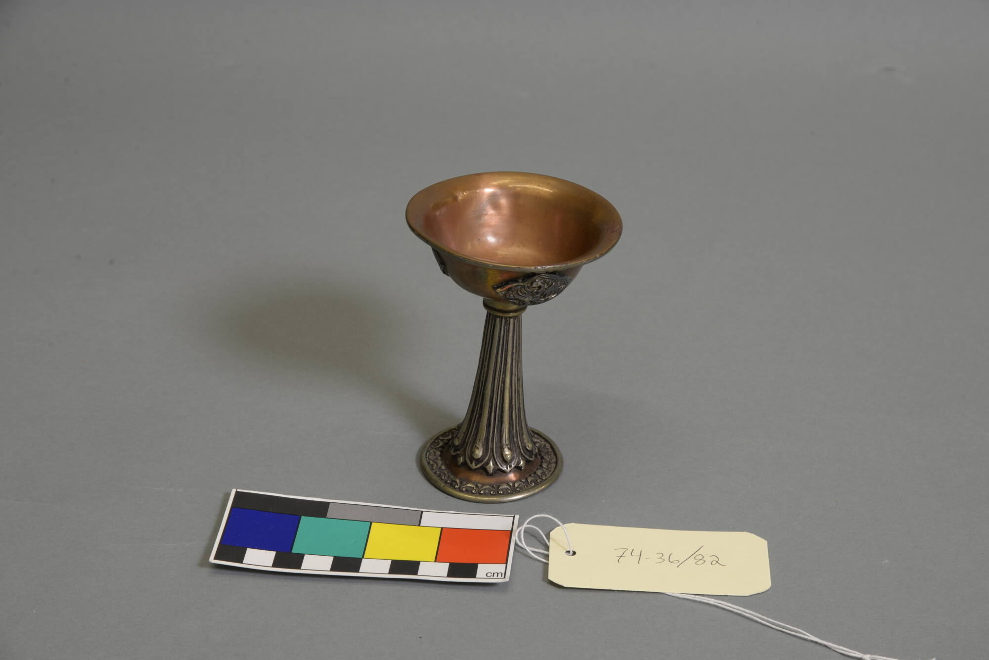 DescriptionCup on a high pedestal, decorated with three medallions with a bird design. A band in silver relief under lip and around foot.