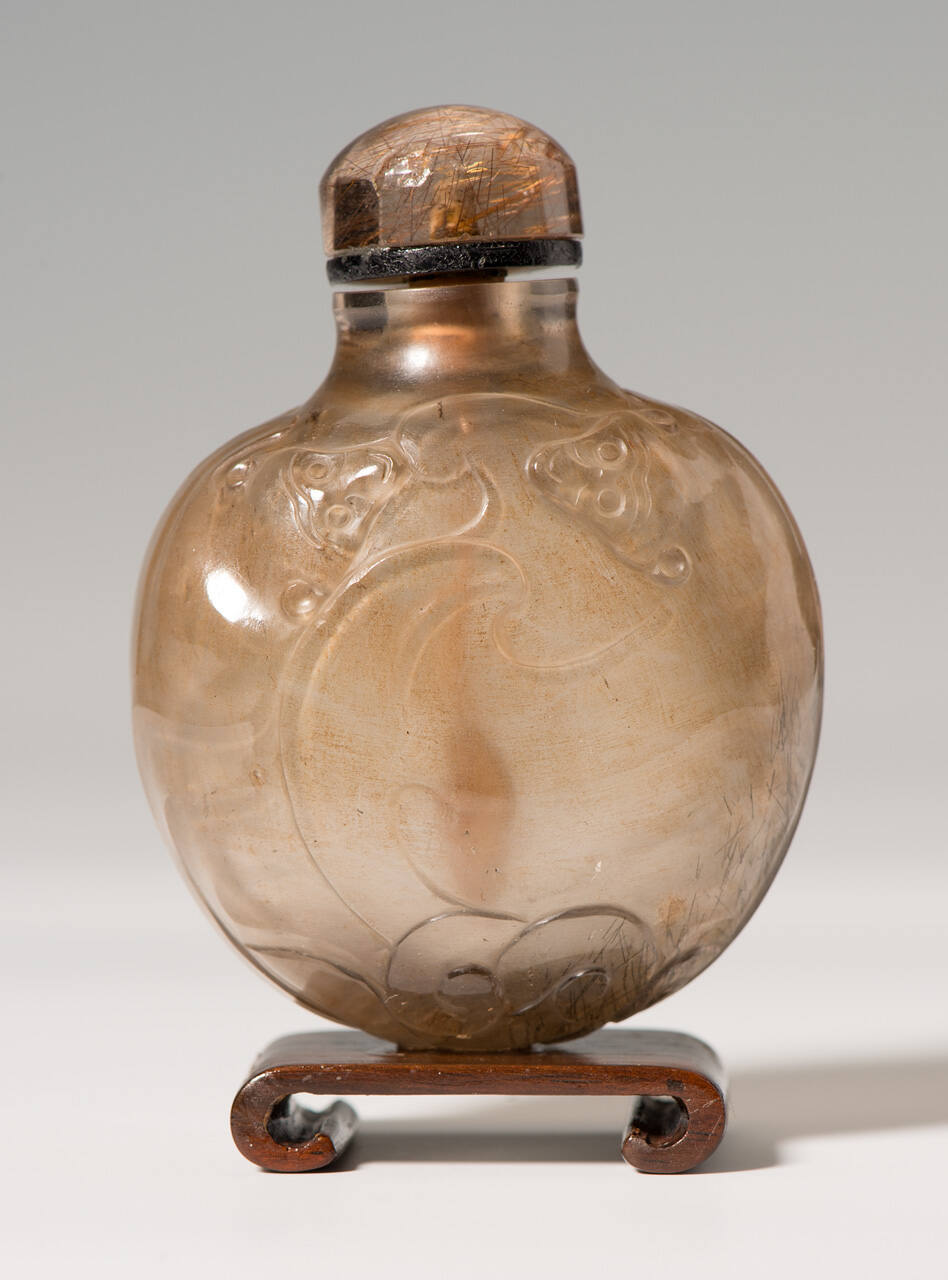 DescriptionFlattened round-shaped tea crystal bottle with black tourmaline needles carved with four bats among clouds, black collar, gold hair crystal stopper.