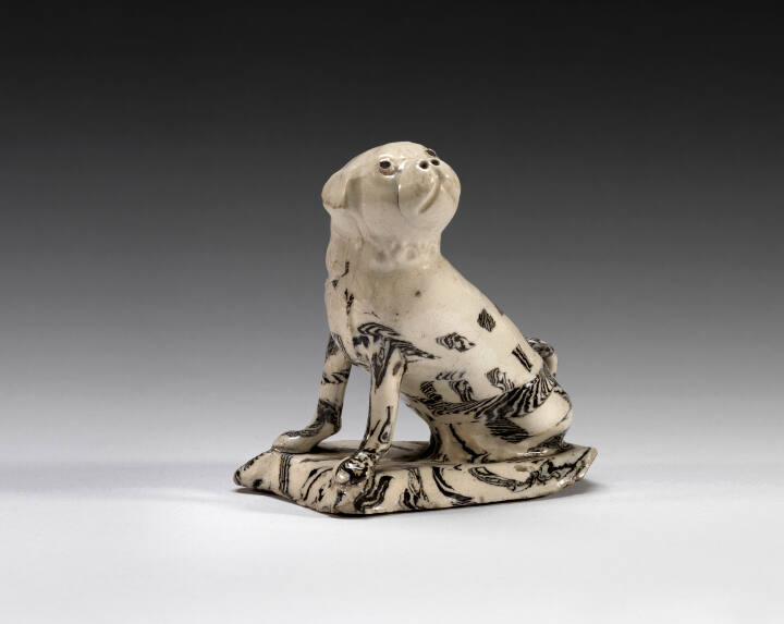 Gallery LabelThe multi-hued clays wedged together, known as agateware, have been manipulated to animate the dog's coat with lively spots.