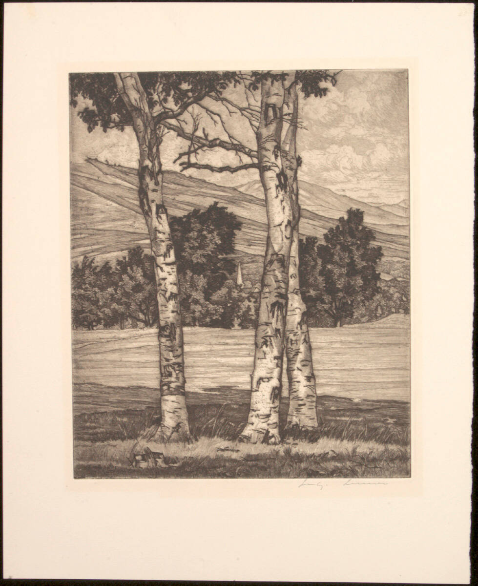 DescriptionThree isolated trees in the foreground, clumped trees in middleground. Rolling hills in the distance.Copyright© Estate of Luigi Lucioni