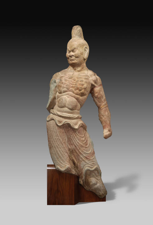 DescriptionBuff-gray sandstone sculpture of a man, torso turned to the right, the eft arm thrust to the rear, held straight and taut; the muscles of the chest and stomach are strongly exaggerated. The right arm, lower part of the legs, and the left hand are broken off. There are traces of red pigment. The head is a replica, with a fierce expression, a sharply downturned, closed mouth and angled eyebrows.Gallery LabelGuardians often appear at the entrance to cave chapels. Because such a guardian is a lower order of deity, the craftsman is free to particularize the expressive content, in this case wrath and ferocity toward evils to be overcome, which stem from the passions and the senses. The exaggerated muscles, taut and powerful, still retain an underlying geometric arrangement but are, nonetheless, descriptively satisfying.