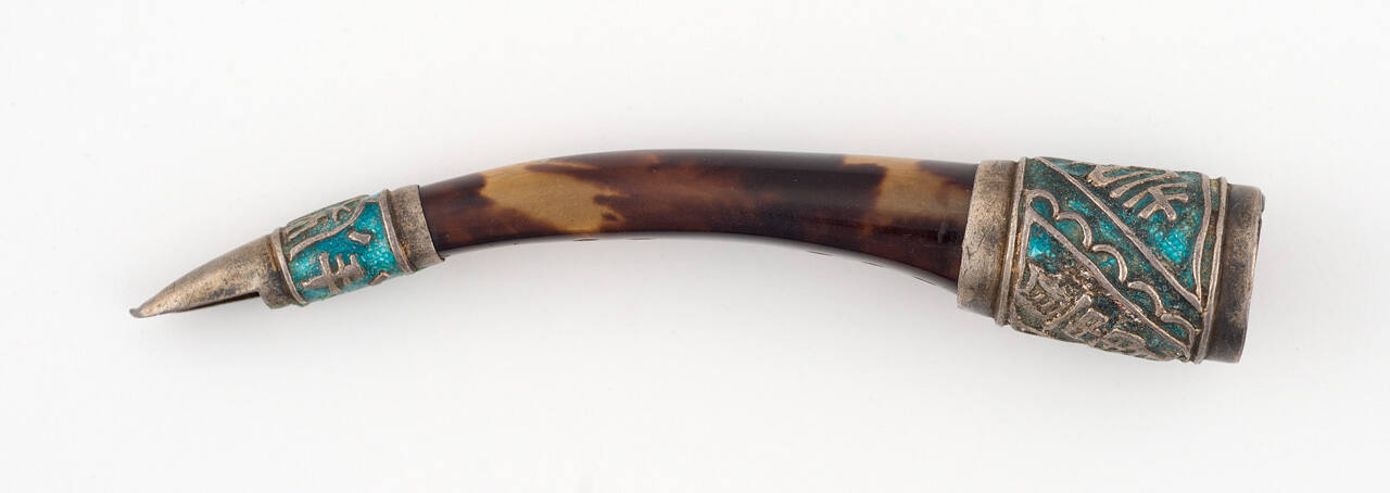 DescriptionCurved tortoise shell fingernail protector with silver and enamel decorations.