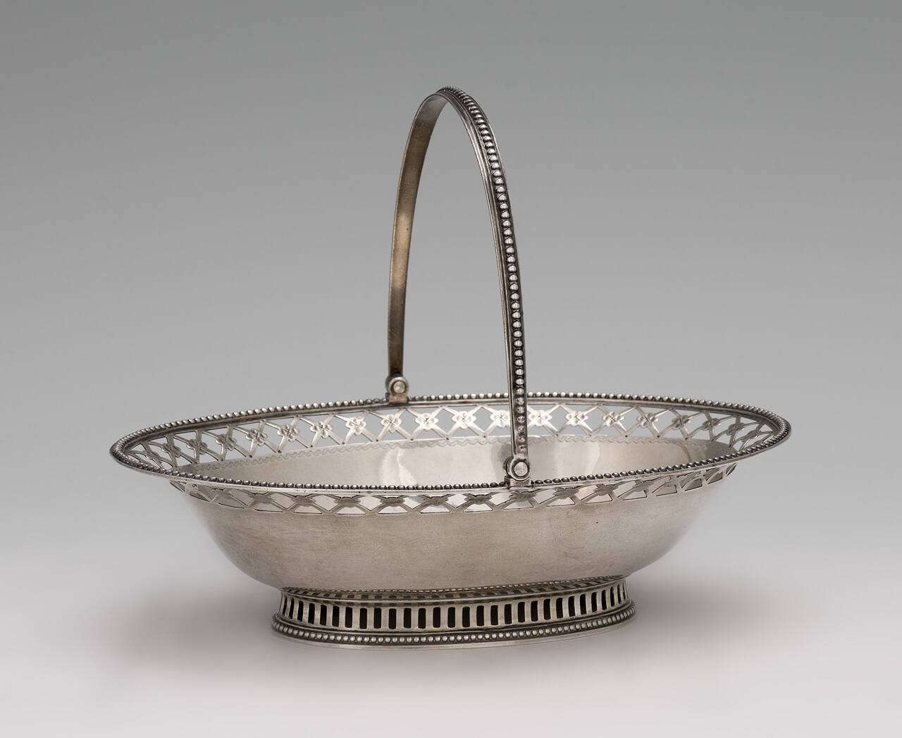 DescriptionArched swing handle, open work on basket border, beaded mounting, on pierced oval foot. Marks on bottom: HB, lion passant, leopard's head crowned, date k (?). All marks rubbed.